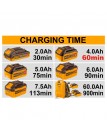Voltaggio in ingresso: 220-240 V~50/60 Hz Voltaggio in uscita: 21V Corrente di uscita: 4A TEMPI DI RICARICA: Ricarica batteria da 20V 2.0 Ah 30min Ricarica batteria da 20V 4.0 Ah 60min Ricarica batteria da 20V 5.0 Ah 75min Ricarica batteria da 20V 6.0 Ah 90min Ricarica batteria da 20V 7.5 Ah 113min Ricarica batteria da 20V 7.5 Ah 120min